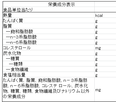 以往日本根據《健康增進法》相關規定,由企業自愿標識營養成分。新食品標識法要求銷售給消費者的加工食品和添加劑上標識營養成分。要求強制標識的營養成分為熱量、蛋白質、脂肪、碳水化合物、鈉等5種成分,鈉以食鹽相當量來標識。推薦標識飽和脂肪酸和膳食纖維2種成分。其他糖類、糖質、膽固醇、維生素、礦物質類由企業自愿標識。