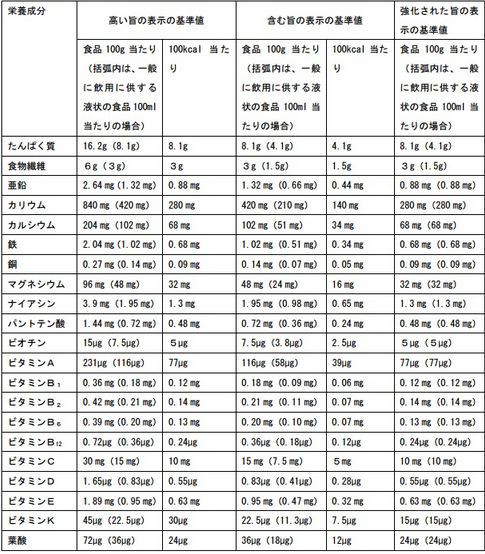表2中列舉了聲稱“富含”、“含有”、“強化”的營養成分含量基準值。蛋白質和膳食纖維的強化聲稱,其含量高于強化基準值以上的同時,與其他產品保持25%以上相對差,所以適用新法之后聲稱“與我公司以往產品相比蛋白質含量提高了20%”是不合法的。