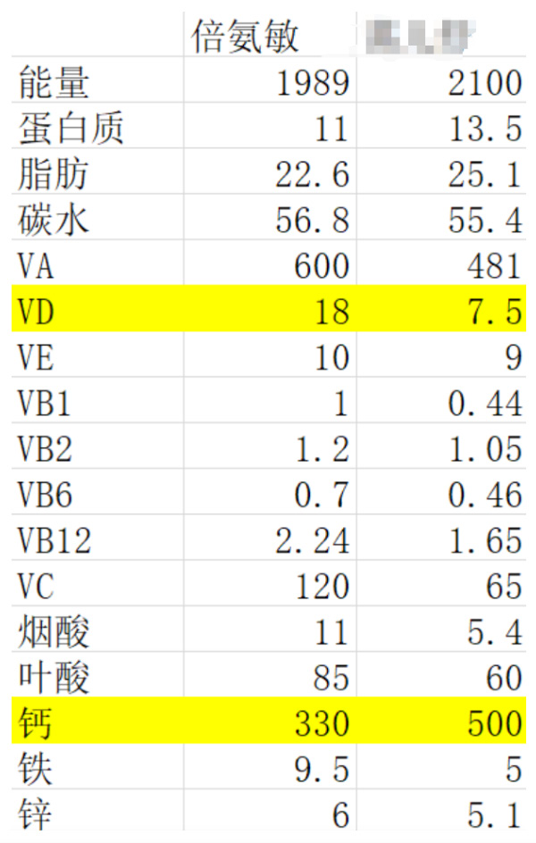 你可以看到,兩者確實(shí)不太一樣,但也沒(méi)有那么大差別,甚至不少微量營(yíng)養(yǎng)素的含量比正規(guī)產(chǎn)品還多。尤其是 VD 的含量比正規(guī)產(chǎn)品多,而佝僂病主要是VD 缺乏引起,醫(yī)生診斷也是 VD 攝入不足。