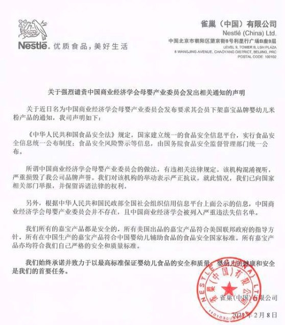 本來也沒多大的事,結果有個叫做“中國商業經濟學會母嬰產業委員會”的機構跳出來,給會員單位發通知,對相關產品“責令下架”。一個嚴重失信機構居然有這么大的官威,我也是 real 服氣。他們可能訛人訛慣了,沒想到這次碰了個釘子,雀巢畢竟是全球第一大食品公司,以為人家食品法規和質量部門是擺設啊?雀巢馬上發了一個強烈譴責的聲明,“來剛我啊”。