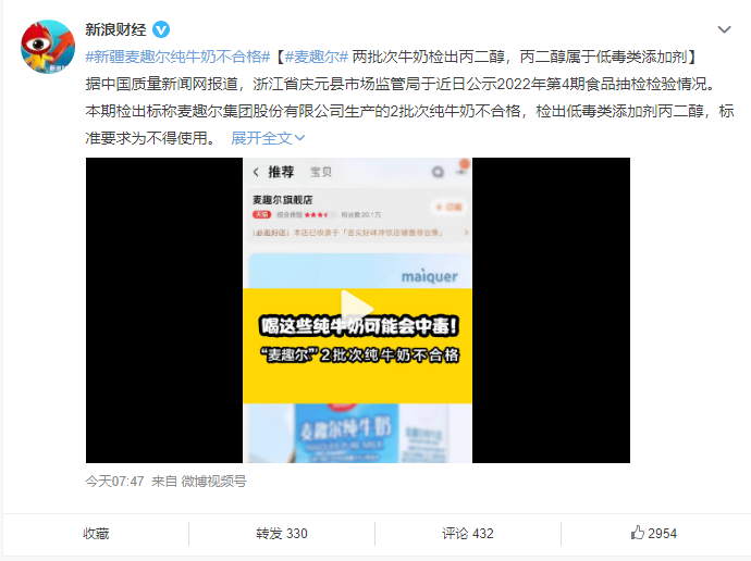 6 月 30 日,“新疆麥趣爾純牛奶不合格”的詞條一度沖上微博熱搜第一。據(jù)中國質(zhì)量新聞網(wǎng)報道,近日,浙江省慶元縣市場監(jiān)管局公示的 2022 年第 4 期食品抽檢檢驗情況中稱,麥趣爾集團股份有限公司(下稱“麥趣爾”)生產(chǎn)的 2批次純牛奶不合格,不合格項目為丙二醇。