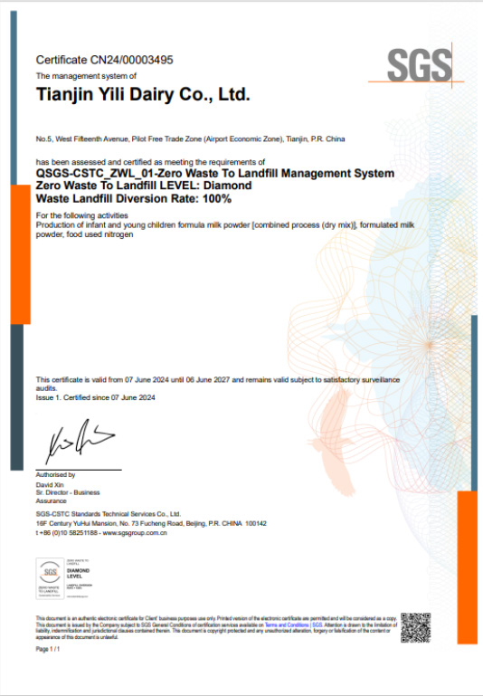 伊利集團首家廢棄物零填埋工廠誕生!伊利集團嬰幼兒營養品事 業部天津伊利乳業有限責任公司獲得由全球領先的認證機構 SGS ...