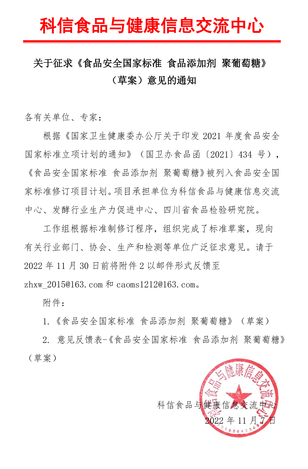 關(guān)于征求《食品安全國家標(biāo)準(zhǔn) 食品添加劑 聚葡萄糖》(草案)意見的通知