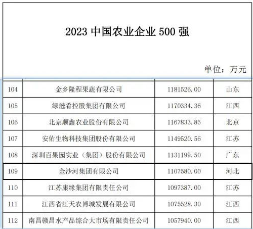 為全面、客觀、系統展現我國農業企業發展情況,營造農業企業參與鄉村振興和建設農業強國的良好社會氛圍,農民日報社發起2023 中國農業企業 500 強評價活動,經信息匯集、嚴格審核、專家評議等程序,形成了《2023 中國農業企業 500 強》,金沙河集團入選中國農業企業 500 強。